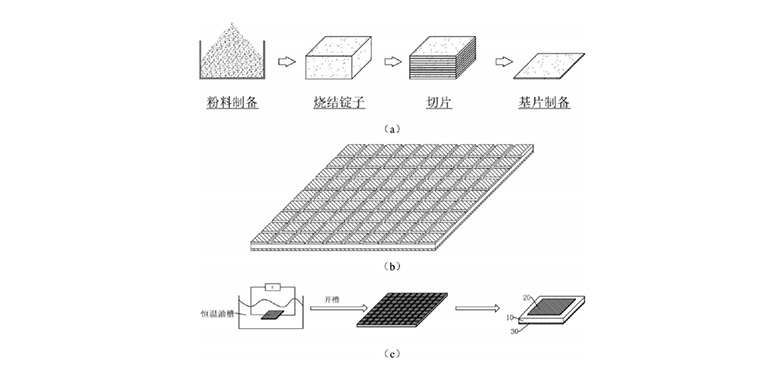 根據(jù)材料配方將各種金屬氧化物(錳、鈷、鐵、鎳、銅、鋅)按照相應比例配制得混合物料;然后將物料倒入模具中,初步手壓成型后,在超高壓下繼續(xù)成型,得到錠子;將錠子加入預先鋪好氧化鋁砂的氧化鋁缽內(nèi),然后用氧化鋁砂填埋錠子后進行燒結(jié),得到燒結(jié)好的錠子;將錠子固定于內(nèi)圓切割機專用夾具上,調(diào)整參數(shù)進行切割,然后用純水超聲清洗干凈后烘干,得到熱敏基片。