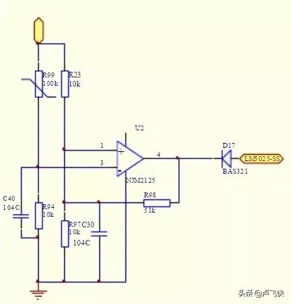 R99熱敏電阻是負溫度系數熱敏電阻,常溫時,R99=100k,R99與R94的分壓0.45V為U2運放的負輸入,遠低于運放的正輸入2.5V(R23與R97分壓),因此運放的輸出是高電平,對LM5025的SS端無影響,模塊正常工作。
