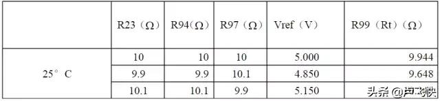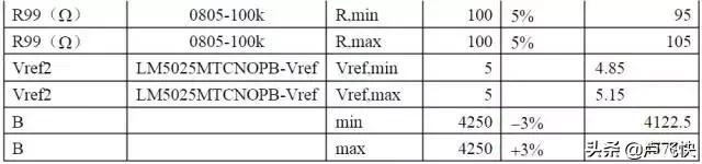 運放輸出低后,電阻R98(51k)就并在R97上,將基準拉低,新的基準電壓Vref1=Vref*(R98//R97)/(R23+R98//R97)=2.28V達到2.44V時,R99的阻值R99=Vref*R94/Vref1-R94=11.9kR99達到10.49k時,溫度按下表計算