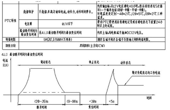 (1)中控鎖280電機光片(插件型基本已經淘汰,極少使用)選型要根據各廠家生產的參數實裝匹配。24V和12V電壓電機的選型方法類同,主要參數是堵轉電流及堵轉電流的變化曲線,因中控鎖正常工作時間很短(不超過1s),不考慮工作工作電流。室溫堵轉保護時間為20~35s理想,但國產電機質量的現實情況溫升較快,一般15~25s保護即可,(少數只能滿足8~15s)。總之在滿足電機不燒毀的情況下,較長的保護時間可以提高PTC的使用壽命,減少誤保護和扭矩不夠的情況。-----(后備箱鎖,方向盤鎖,油路鎖選型方法類似)