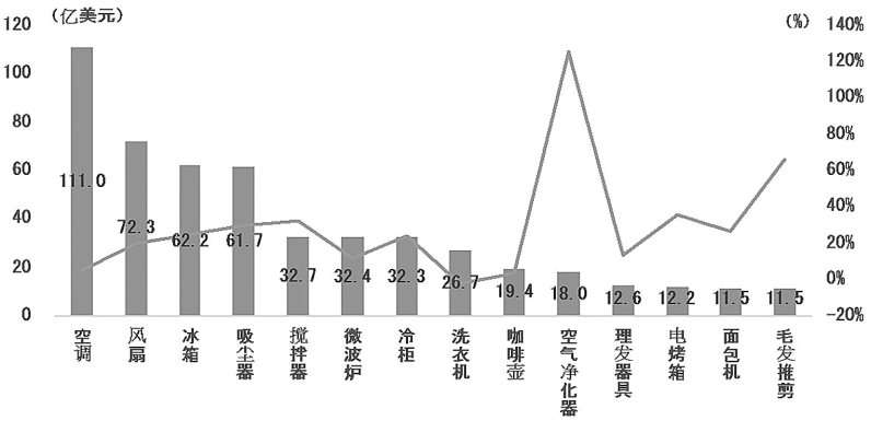 2020 年1~12月小家電及零件出口533.9億美元,較上年同比增長26.1%。與居家抗疫相關(guān)度高的攪拌榨汁類產(chǎn)品,電炒鍋、電烤箱及面包機(jī)等廚房小家電,以及電推剪產(chǎn)品需求明顯增多,從第二季度開始持續(xù)增長。其中攪拌器和榨汁機(jī)出口量較上年同期分別增長29.6%和24.5%;微波爐、電炒鍋、電烤箱及面包機(jī)出口量較上年同期分別增長12.7%、24.7%、28.2%和17.2%;電推剪出口量較上年同期增長37.1%??諝鈨艋?、加濕器等產(chǎn)品近年來本就處在上升期,再受到疫情居家因素拉動(dòng),出口大幅增長,空氣凈化器、加濕器、干洗機(jī)、洗碗機(jī)分別較上年同期增長74.7%、36.9%、32.8%和28.8%。