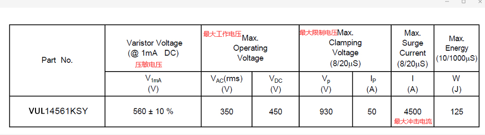 2.  關(guān)于壓敏選型,例如220V的工作電壓,由于電網(wǎng)有波動因素,我們經(jīng)驗的需要,加上一個安全系數(shù)。公式:220*1.414=311,得出311V的工作電壓,那么選用的壓敏工作電壓就要大于我們得出的電網(wǎng)工作電壓311V。如下圖產(chǎn)品TVR14511KSY的工作電壓VAC是320V,大于電網(wǎng)工作電壓311V,那么我們就可以選用這款壓敏電阻。但是根據(jù)環(huán)境電壓波動,可以選用工作電壓再大一點的壓敏電阻,如下圖產(chǎn)品TVR14561KSY,這樣就會更保險。
