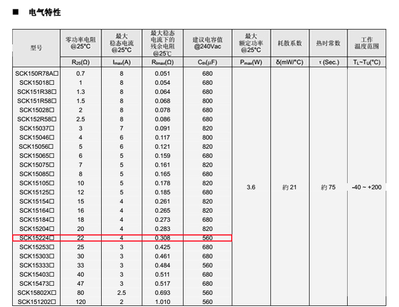 熱敏電阻: 穩騰 熱敏電阻型號: SCK15224MSY 熱敏電阻片徑: Φ15mm 零功率電阻@25℃: 22Ω 工作溫度范圍: -40℃±200℃ 儲存溫度范圍: -40℃±85℃