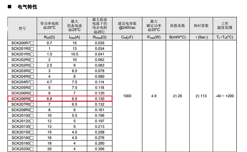 熱敏電阻: 穩騰 熱敏電阻型號: SCK206R8MSBY 熱敏電阻片徑: Φ20mm 零功率電阻@25℃: 6.8Ω 工作溫度范圍: -40℃±200℃ 儲存溫度范圍: -40℃±85℃