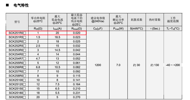 熱敏電阻: VT 熱敏電阻型號: SCK251R0MSY 熱敏電阻片徑: Φ25mm 零功率電阻@25℃: 1Ω 工作溫度范圍: -40℃±200℃ 儲存溫度范圍: -40℃±85℃