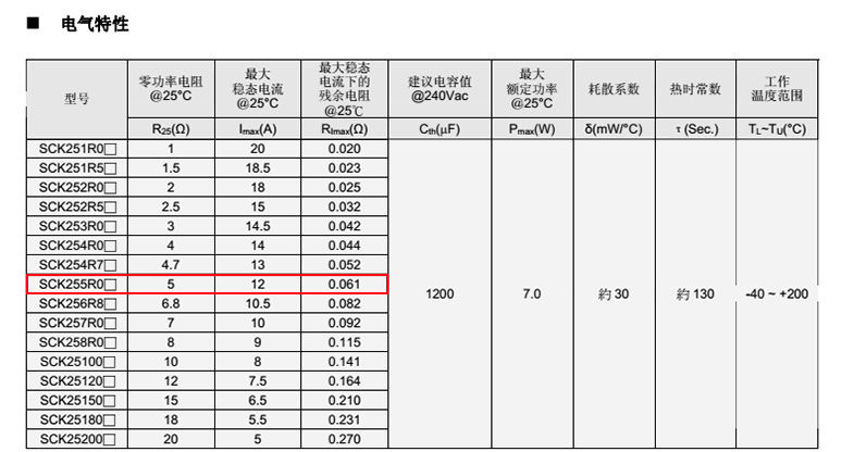 熱敏電阻: VT 熱敏電阻型號(hào): SCK255R0MSY 熱敏電阻片徑: Φ25mm 零功率電阻@25℃: 5Ω 工作溫度范圍: -40℃±200℃ 儲(chǔ)存溫度范圍: -40℃±85℃