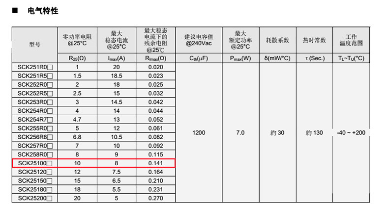 熱敏電阻: VT 熱敏電阻型號: SCK25100MSY 熱敏電阻片徑: Φ25mm 零功率電阻@25℃: 10Ω 工作溫度范圍: -40℃±200℃ 儲存溫度范圍: -40℃±85℃