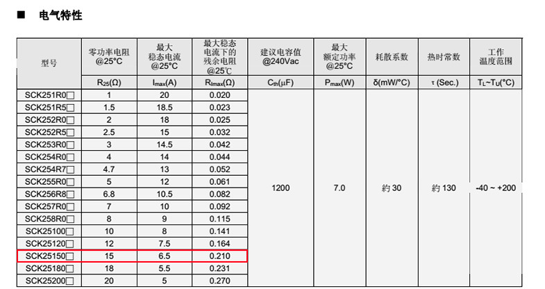 熱敏電阻: VT 熱敏電阻型號: SCK25150MSY 熱敏電阻片徑: Φ20mm 零功率電阻@25℃: 15Ω 工作溫度范圍: -40℃±200℃ 儲存溫度范圍: -40℃±85℃