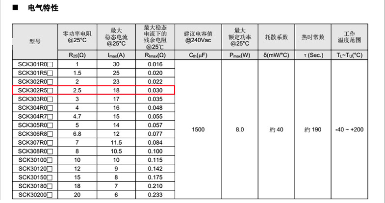 熱敏電阻: VT 熱敏電阻型號: SCK302R5MSY 熱敏電阻片徑: Φ30mm 零功率電阻@25℃: 2.5Ω 工作溫度范圍: -40℃±200℃ 儲存溫度范圍: -40℃±85℃