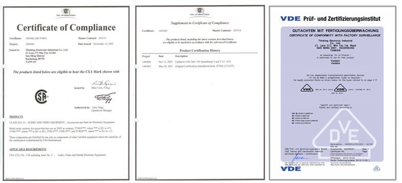 認證包括:UL、CUL、VDA、CSA、CQC、 SGS